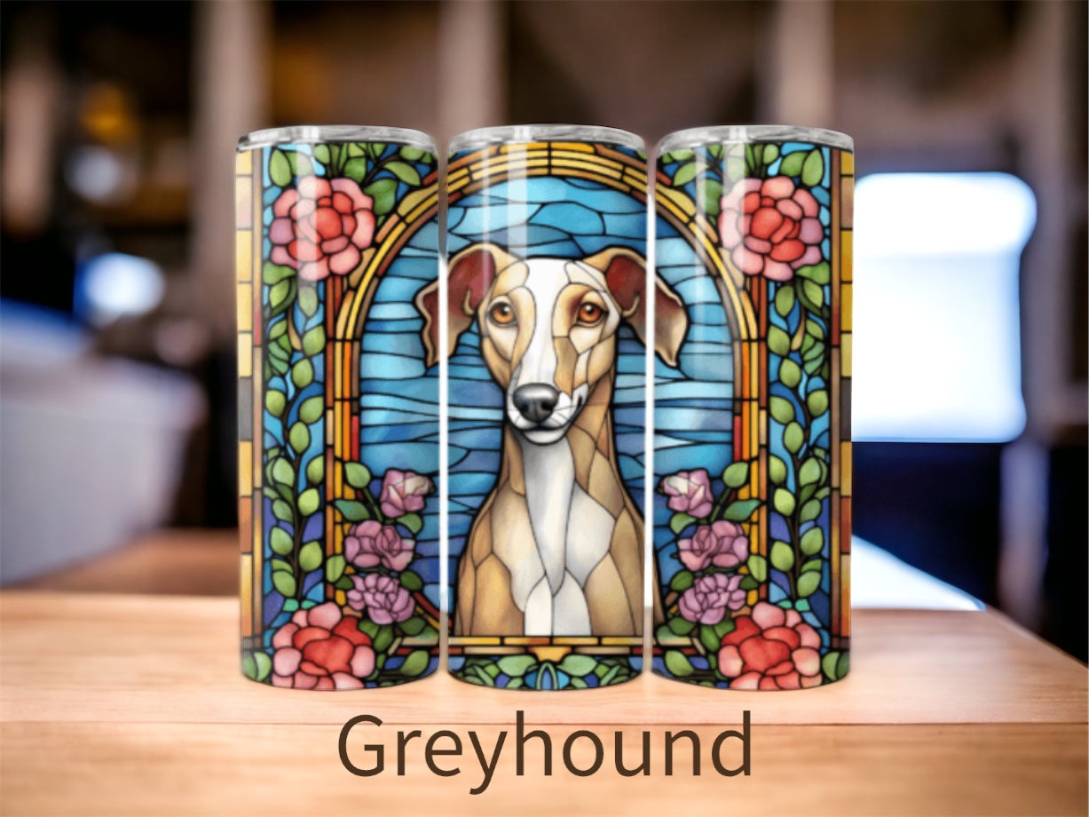 Cheers to your furry best friend with our unique Greyhound Stained Glass 20 oz stainless steel tumbler! This eye-catching beverage accessory is the perfect way to show the world your pup pride. Keep your drinks cool and cute with our custom cup!
