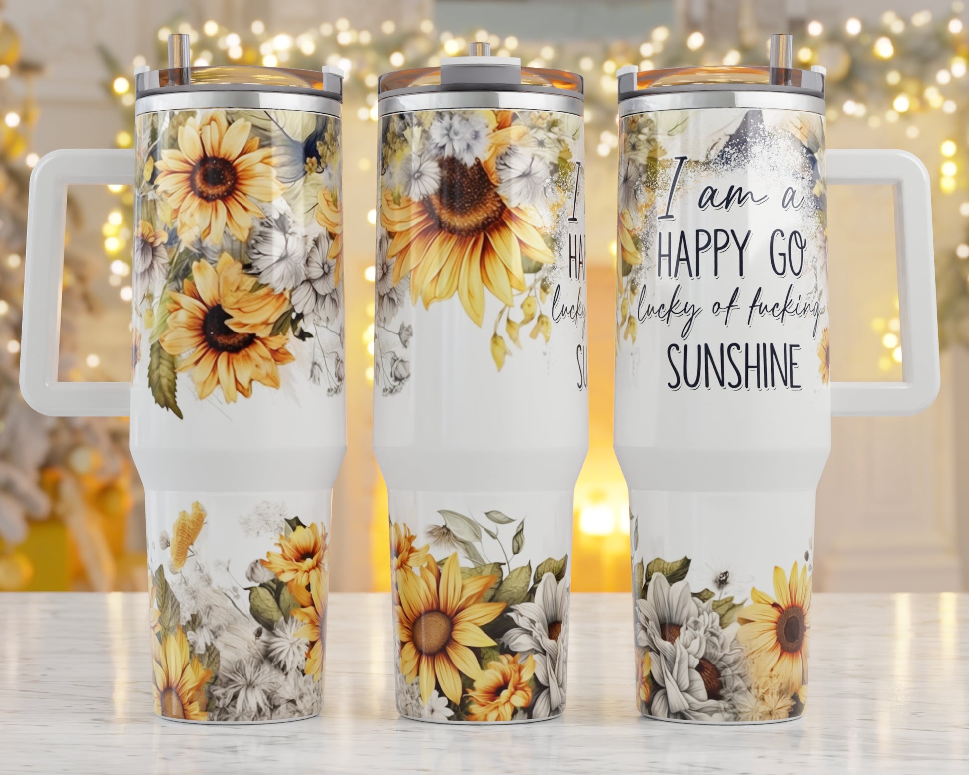 Introducing our Happy Go Lucky Ray of F****** Sunshine tumbler, perfect for those who radiate "positivity!" This 40 oz tumbler will keep your drinks hot or cold and comes with a touch of snark. Start your day right with a boost of energy and a side of sass.