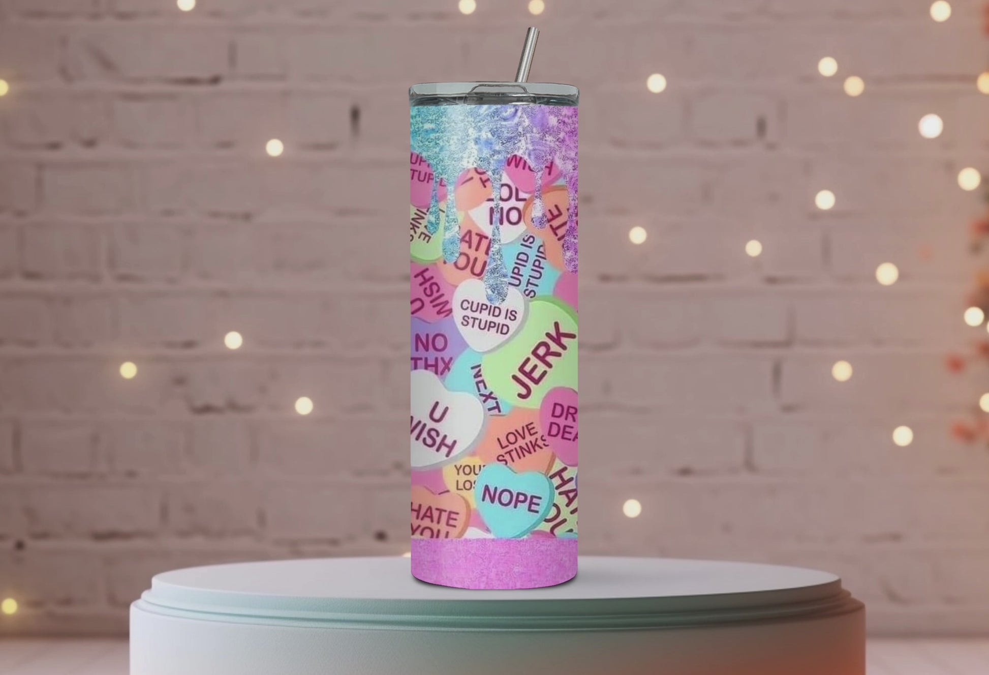 "Say no to lovey-dovey nonsense with our Candy Heart Anti-Valentine Tumbler. Keep your beverage cool and your heart cold with this tumbler. Perfect for those who don't take Valentine's Day too seriously. (Also great for keeping your drink from getting too sweet! 😉)"