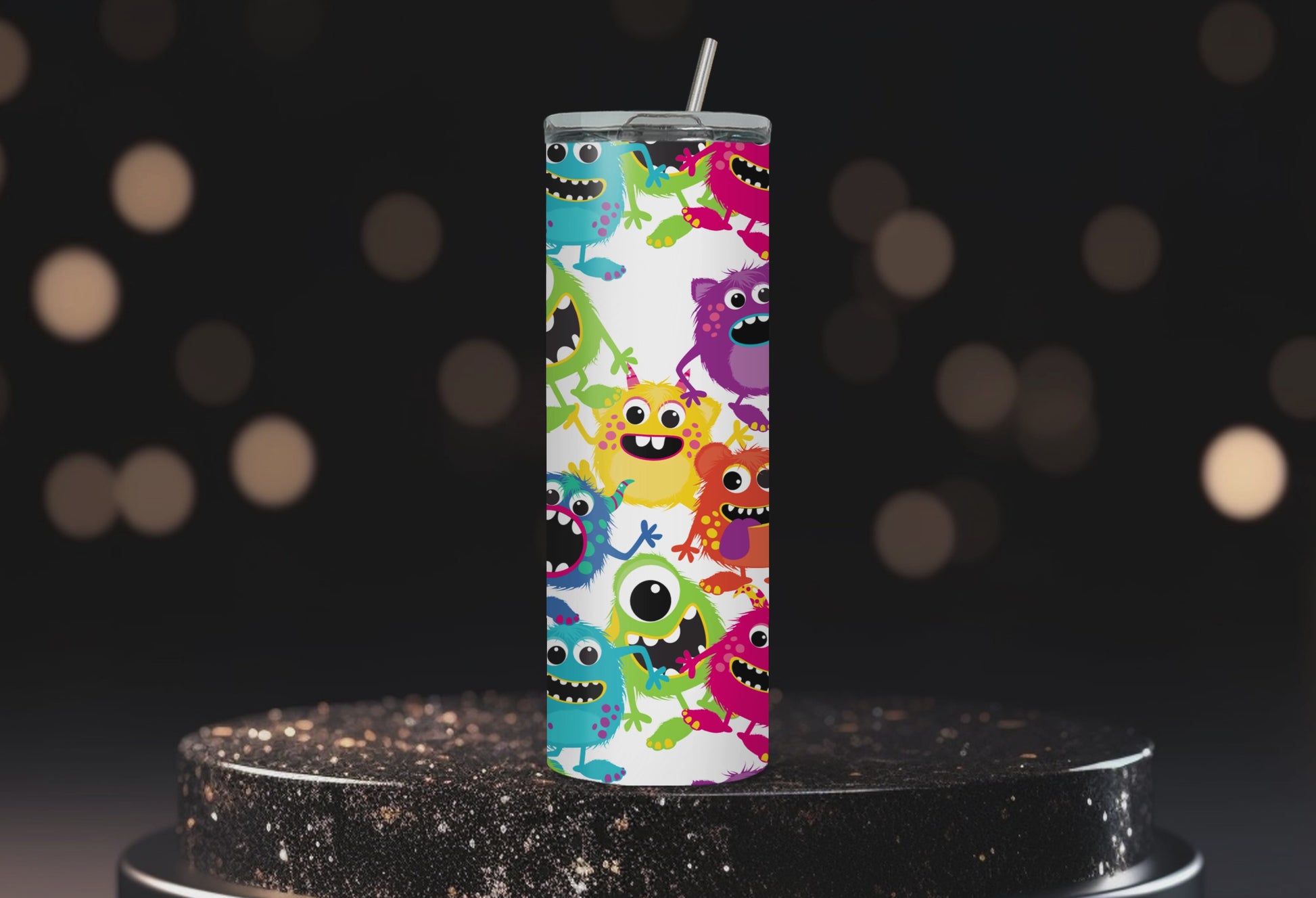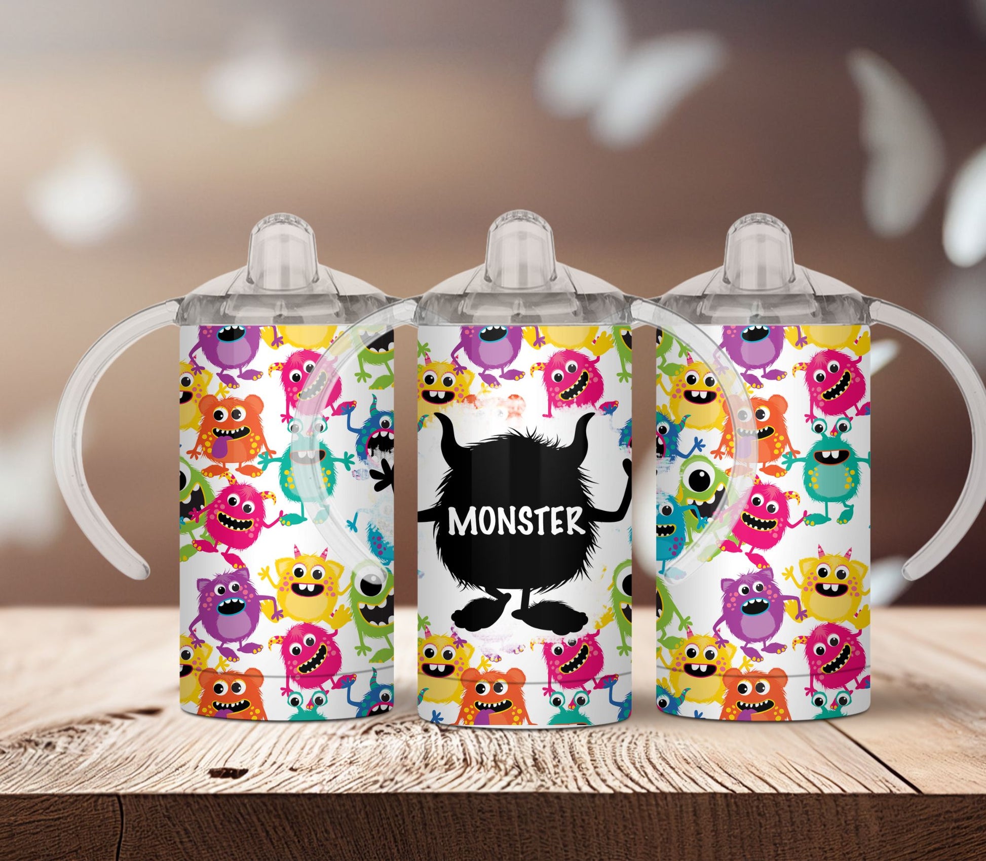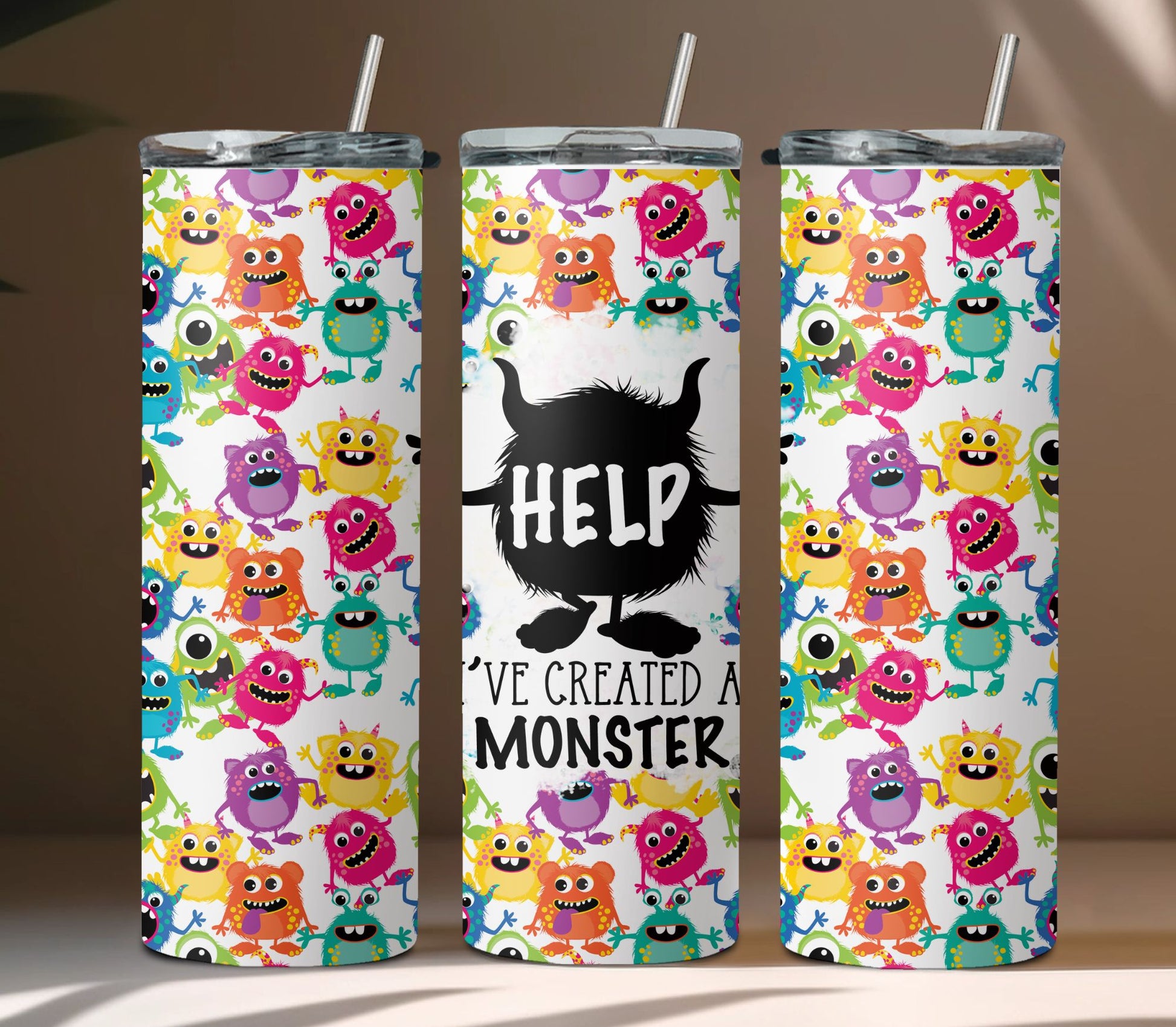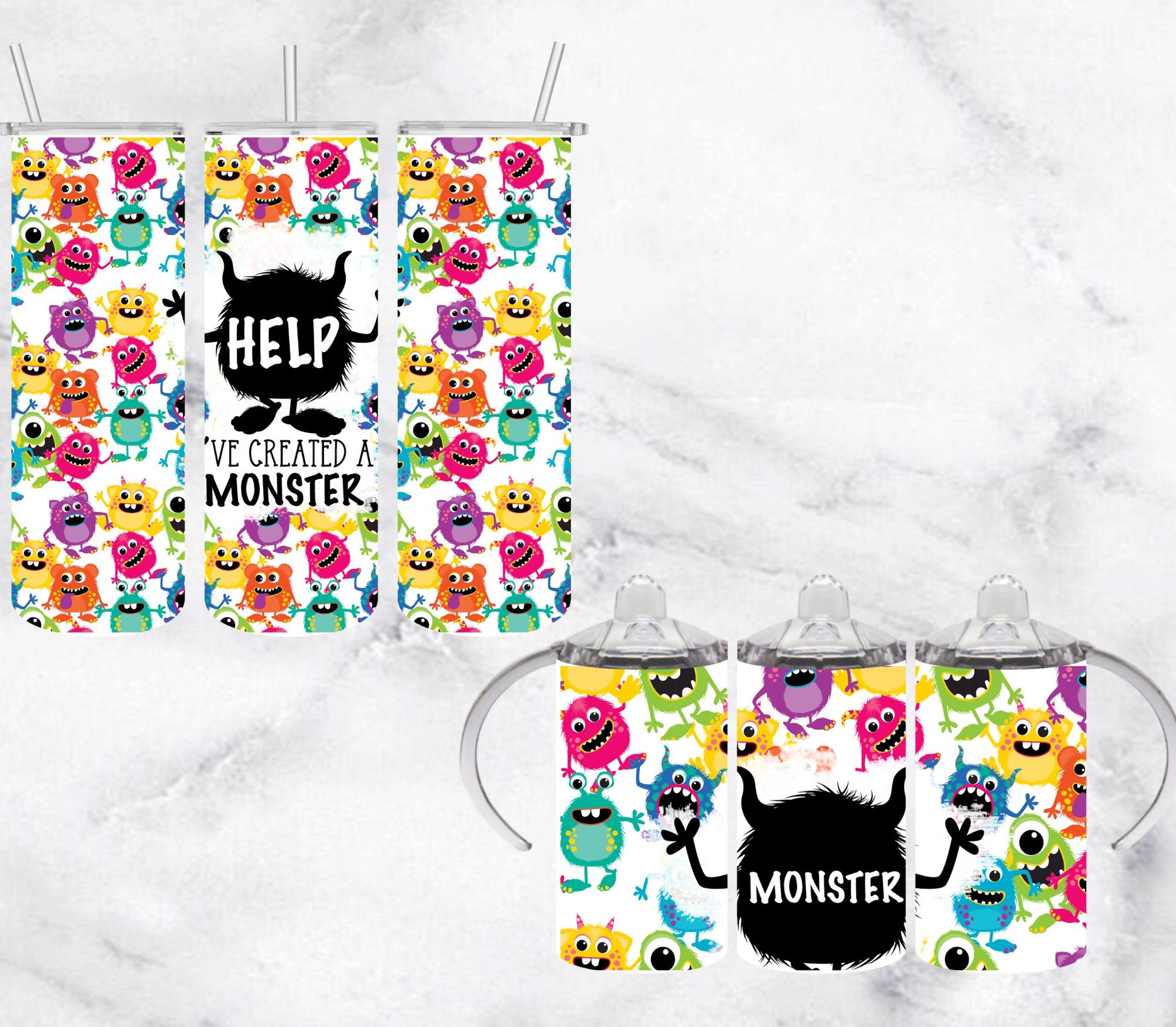 Includes one 20-ounce cup that says "Help I've created a Monster" that includes a lid and Straw and one 12-ounce kids' tumbler that includes a regular lid and straw, as well as a sippy cup lid with stopper that says "Monster"