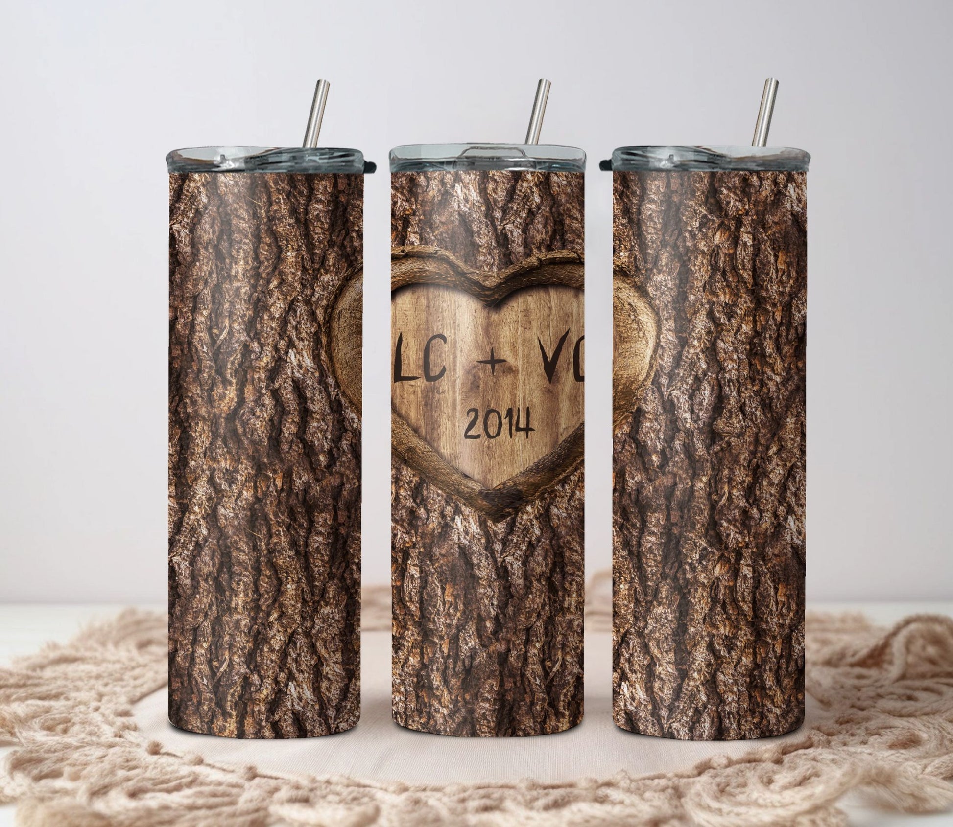 Display your love in a fun and personalized way with our Tree Carving Tumbler. Customize with your initials etched in a tree carving design. Insulated to keep drinks hot or cold for hours, it's the perfect gift for your significant other (or yourself!).