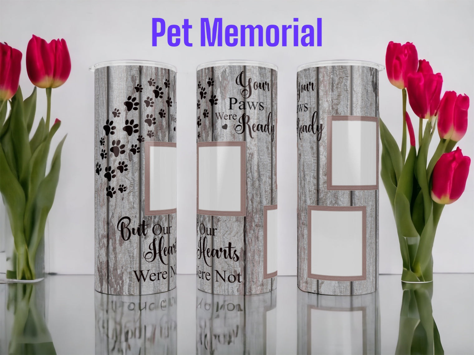 Honor the memory of your beloved pet with the Pet Memorial tumbler. Once you order send a message through the website with pictures.