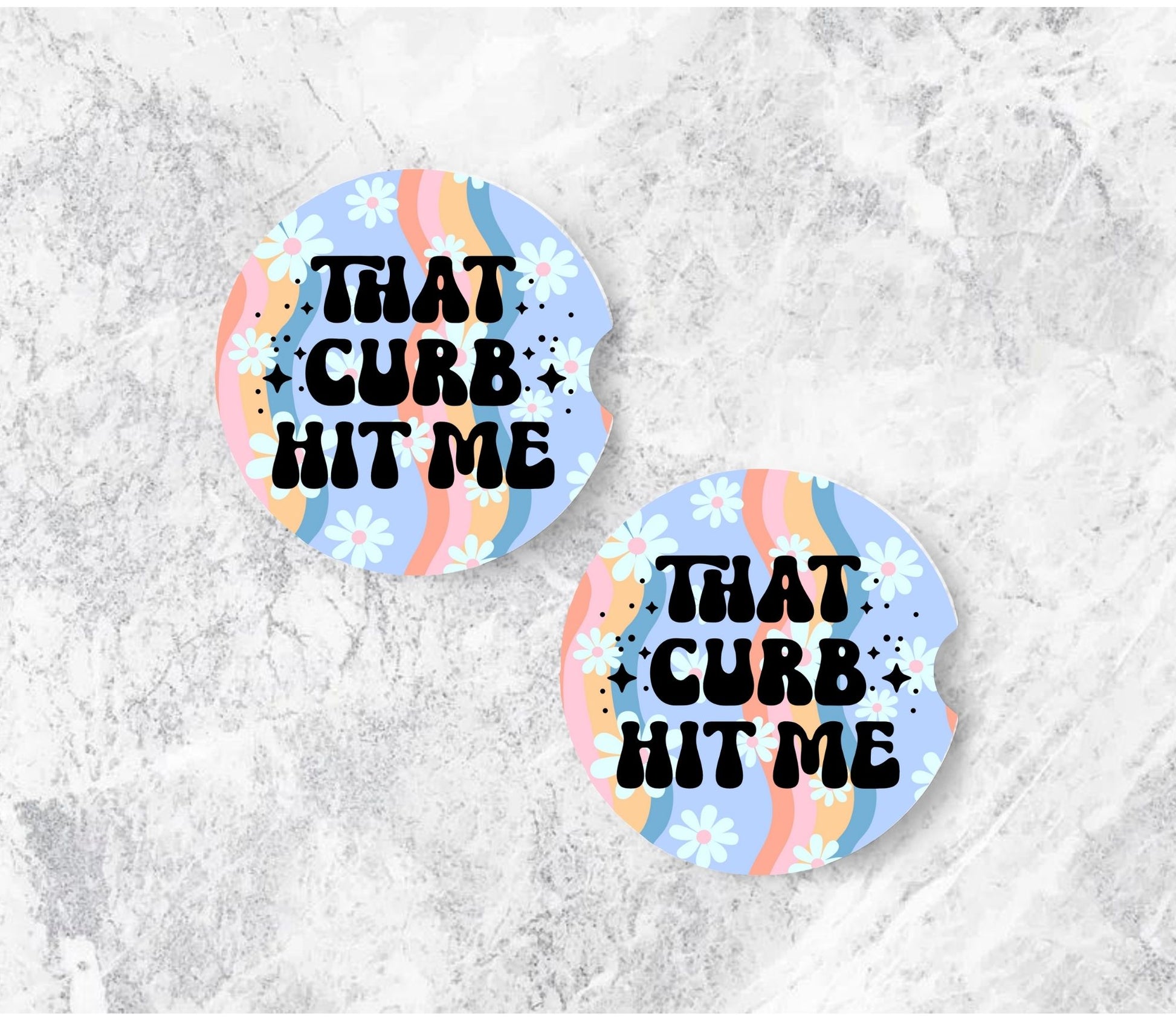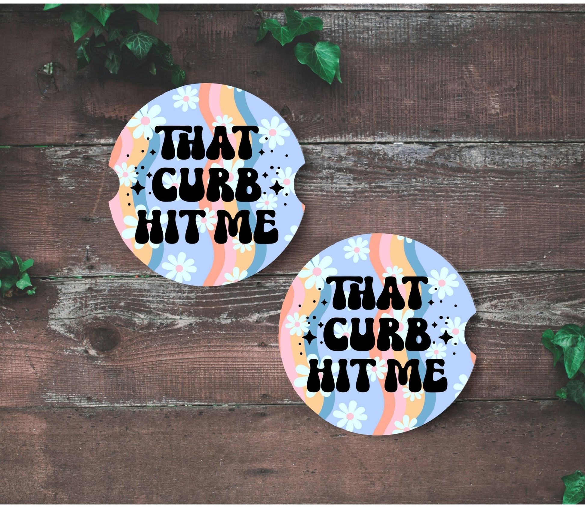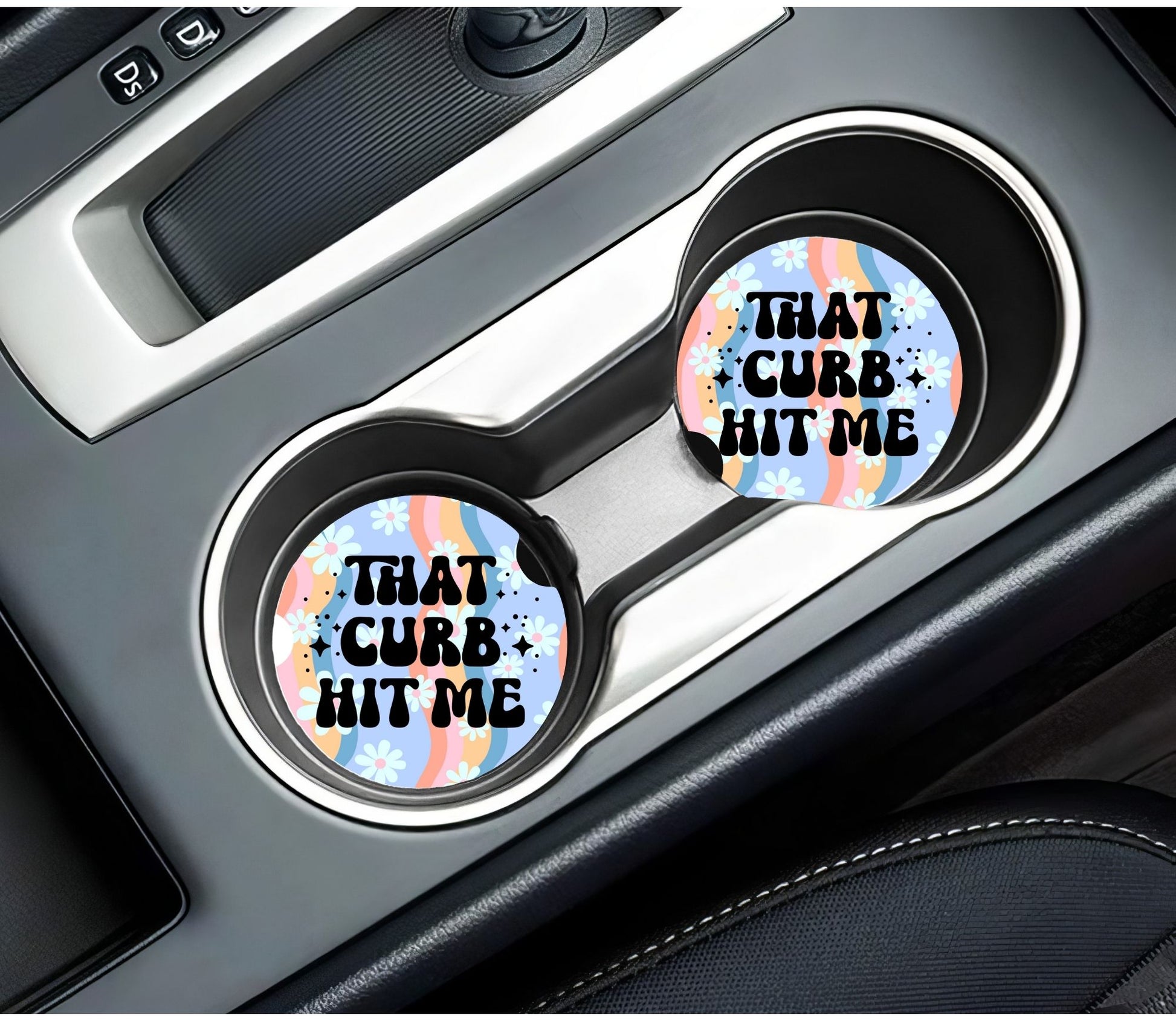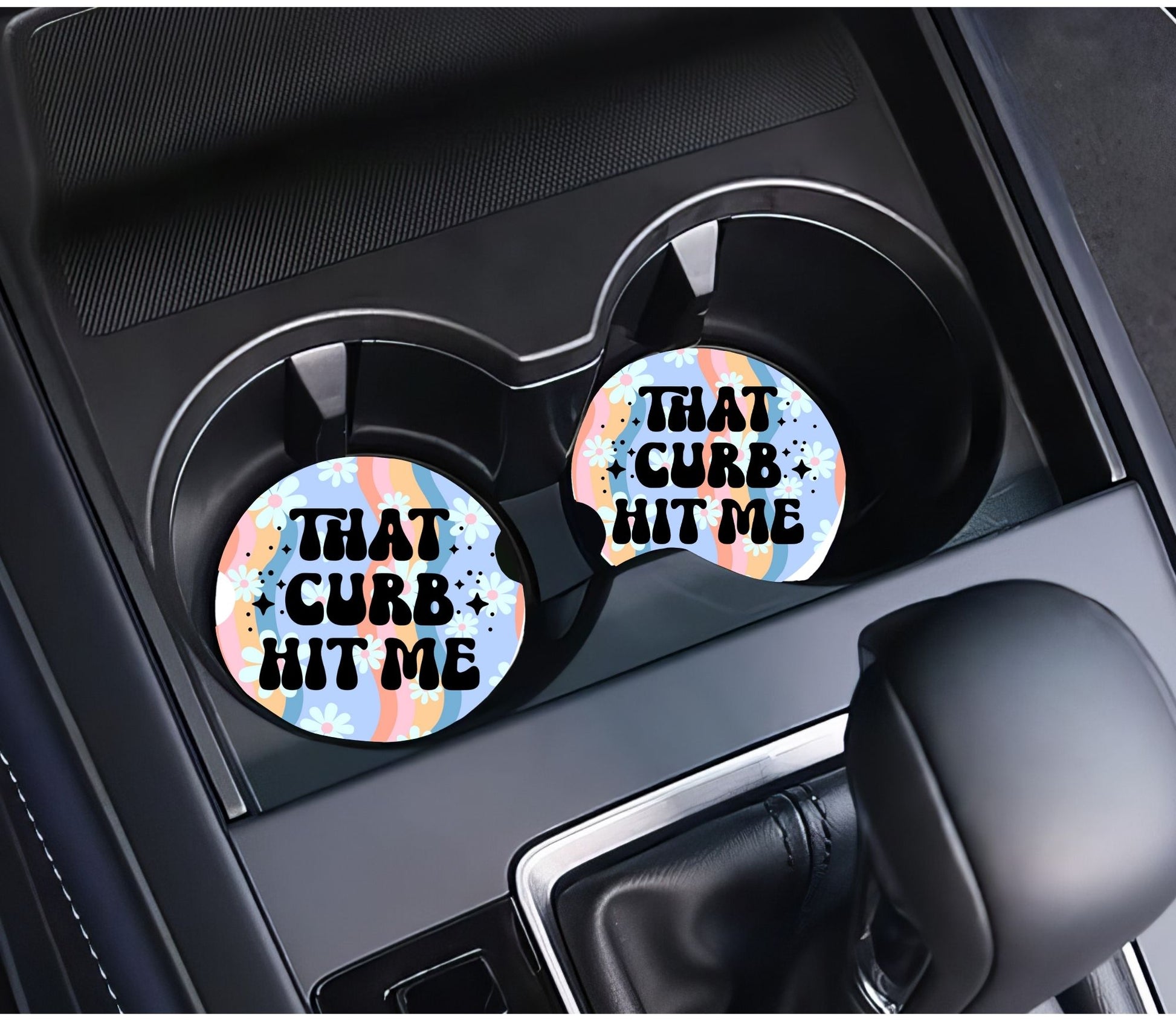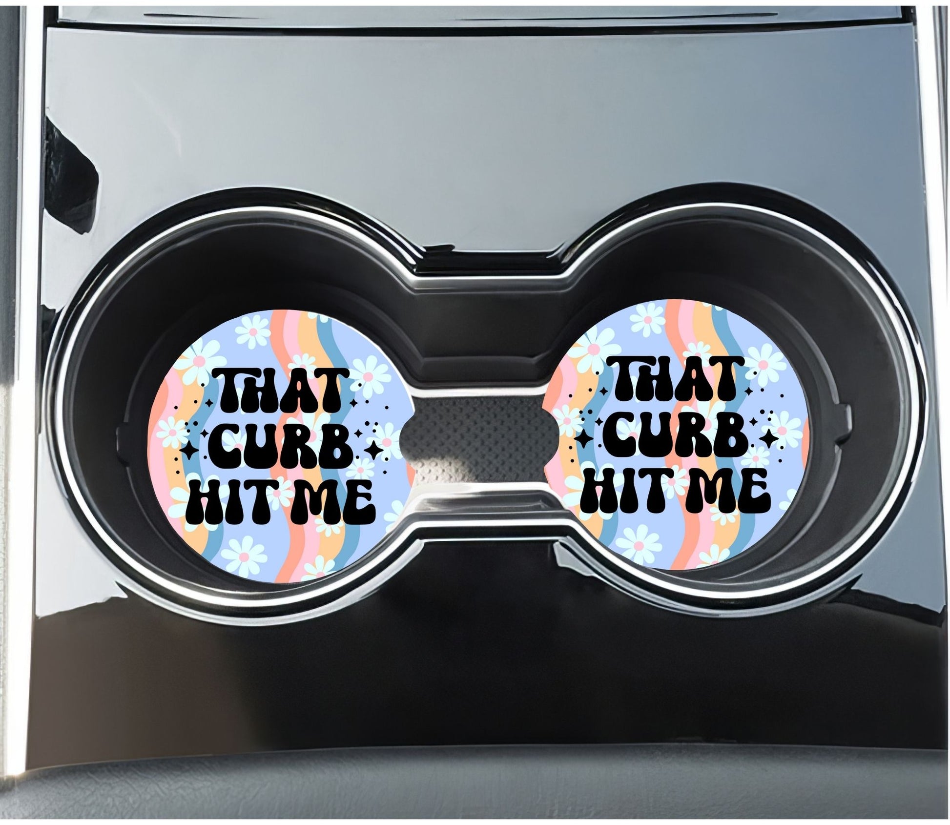 Protect your car's cup holder with That Curb Hit Me Car Coaster! Made of ceramic, it adds a quirky touch while keeping your cup holders clean. Enjoy a playful vibe while driving. (Note: coaster may not actually cushion impact from curbs.)